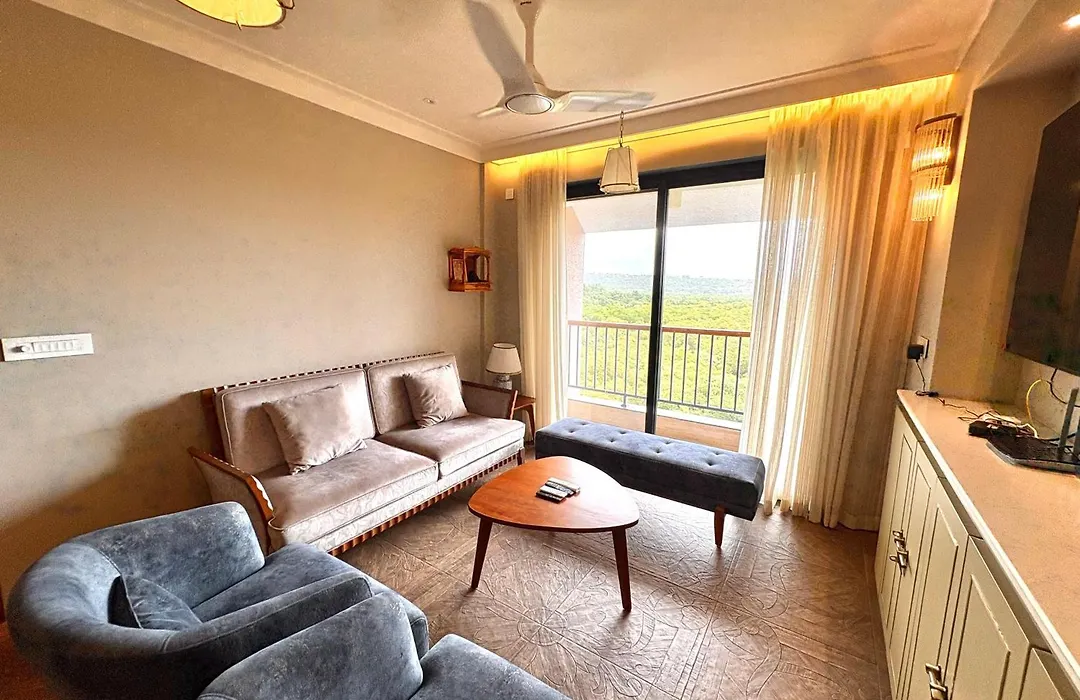 El Candolim 2Bhk Cozy Apartment With Mangrove View & Pool - Walk To Beach ofrece a sus huéspedes un cuarto de estar, un balcón y una cocina, así como comodidades tan modernas como climatizador.